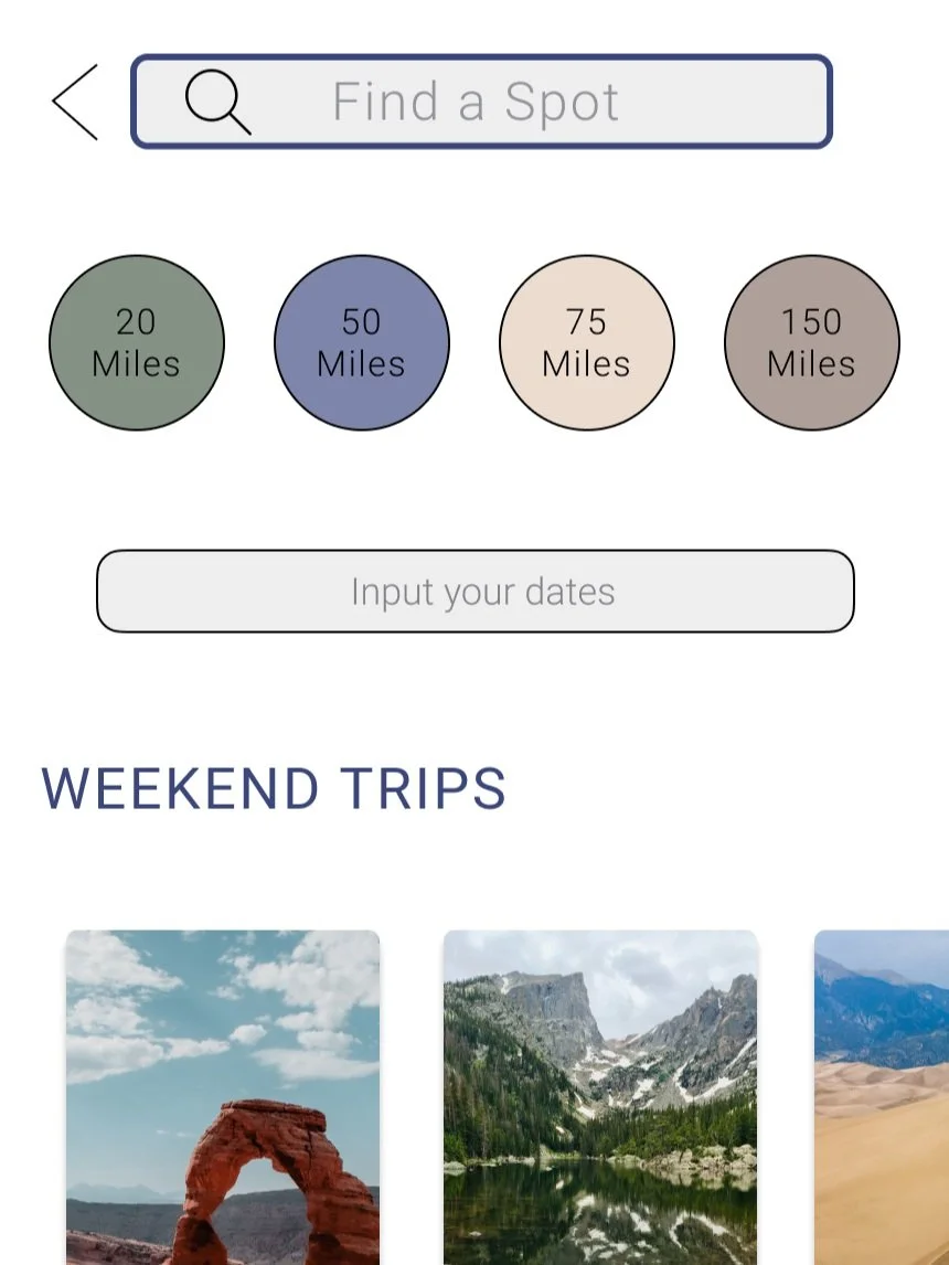 For the search page I wanted several ways to search. Either by date or distance. Some campers expressed that distance is more important than dates while others really wanted to search specific dates. I also added a spot for weekend trips that are based on the campers location as well as availability for the upcoming weekend.
